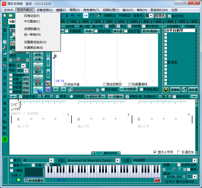 恒乐交响曲是目前最快速的作曲软件!会源源不断自动作曲并演奏、为用户提供了快捷的自动或手动的音乐创作空间。可在鼠标点击的瞬间生成一首大师级的乐曲的主旋律、可为现成的歌词配曲、有多种现…